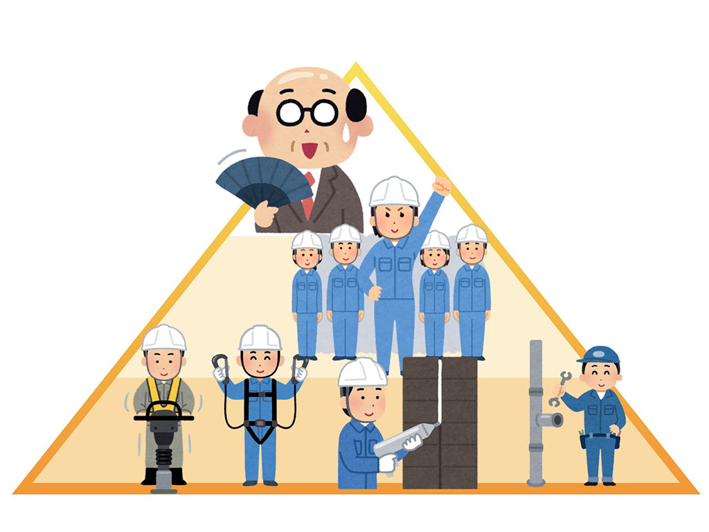 杭が支持層に達していないと問題になったパークシティLaLa横浜などでも話題になりましたが、ゼネコンの下請けが何重にもなっている問題です。下請け・孫請・ひ孫請など何層にもなっているため、実際に工事している業者には格安の工事費しか渡っておらず、十分な管理ができないという問題です。ゼネコンが下請け業者に1億円払うとします。下請けは2割引いた8000万円で孫請に発注します。その孫請が2割引いた6400万円でひ孫請に発注しているため、実際に工事するひ孫請の会社は十分な工事費をもらえないのです。