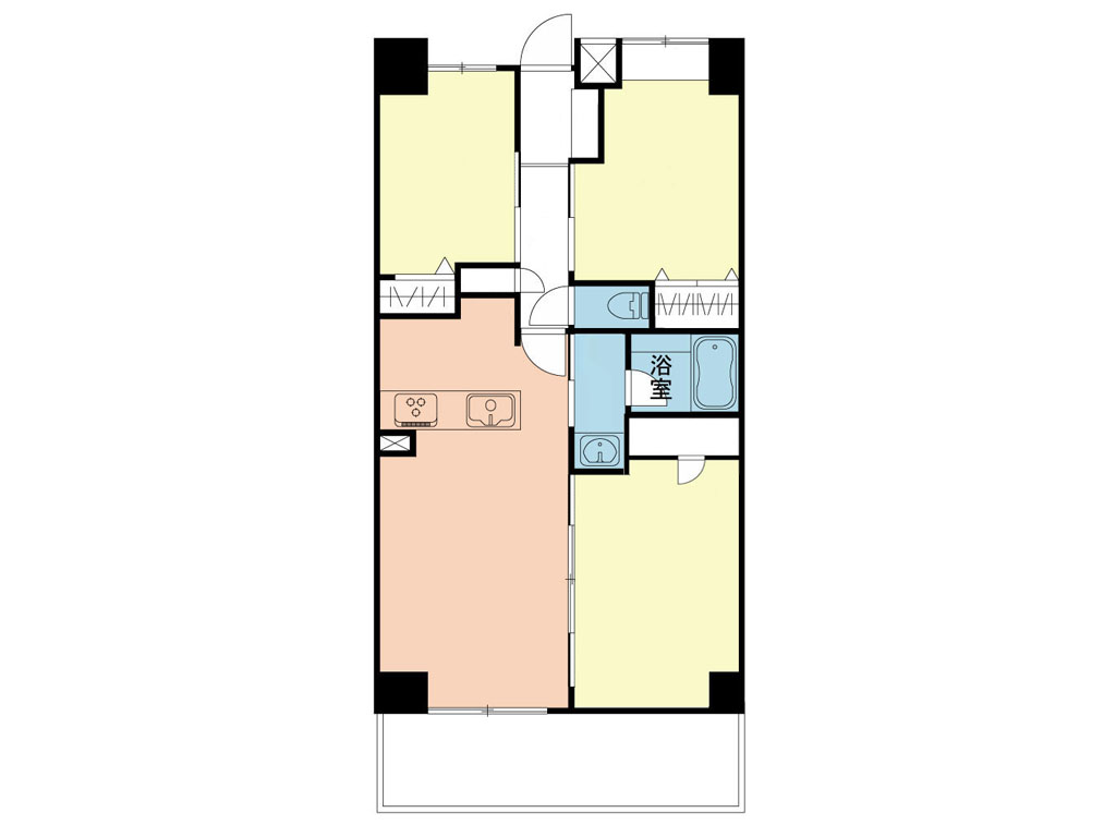 以下の図は下枠があるマンションの間取りで、リビング・ダイニング・キッチン(LDK)、廊下、洋室のフローリングを張り替えるとします。