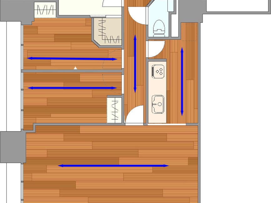 このようにフローリングを貼る距離が変わると、フローリングに大きな影響が出てきます。現在のフローリングは複合フローリングなので、湿度変化による膨張や収縮は小さくなっています。しかしあまりに長い距離を貼ると1枚1枚の膨張や収縮が重なり、大きな変化をもたらします。特に梅雨時になると湿度でフローリングが膨張し、フローリングが盛り上がることがあります。
