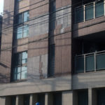 物件が特定されない範囲で書いていきます。マンションは地上8階建ての鉄筋コンクリート構造で、総戸数は70戸を下回る中規模物件です。地元の不動産業者が売主で、設計も施工も地元の業者です。2年前の築11年目に大規模修繕工事を行っています。外壁の仕上げはタイルと吹き付けの併用で、今回剥落したリブの部分は吹き付け仕上げでした。