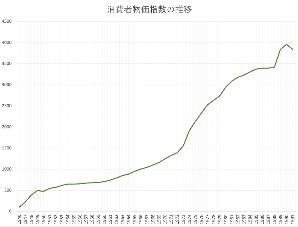 これに変化を与えるのが急激なインフレです。下のグラフは、戦後の消費者物価指数の推移です。戦後すぐにインフレが起こっていますが、特に1970年代に入ると急激なインフレが起こっていることがわかります。このインフレにより大きな借金をして住宅を購入しても、住宅を購入した方が得になりました。生活を切り詰めて頭金を貯め、住宅ローンを組めるギリギリいっぱいの額で組んで住宅を購入することで、将来的な利益が見込めたのです。そのため、マイホームを持てない人は頭金を貯められない人ということになり、いつまでも借家に住んでいる人は一人前ではないと見られるようになりました。住宅ローンが組めない人は、将来性がない人になったのです。