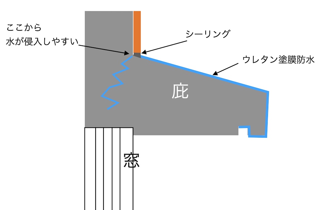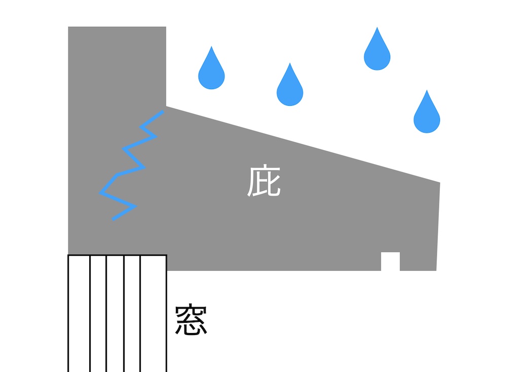 多くの場合、庇はコンクリートで作られています。壁と庇をコンクリートで一体化することで、漏水が少ない庇になるからです。しかし庇は片持ちになってしまうため、どうしても壁との付け根にヒビが入りやすく、そこから雨水が侵入します。やがて雨水はサッシに到達し、室内に漏水することになるのです。