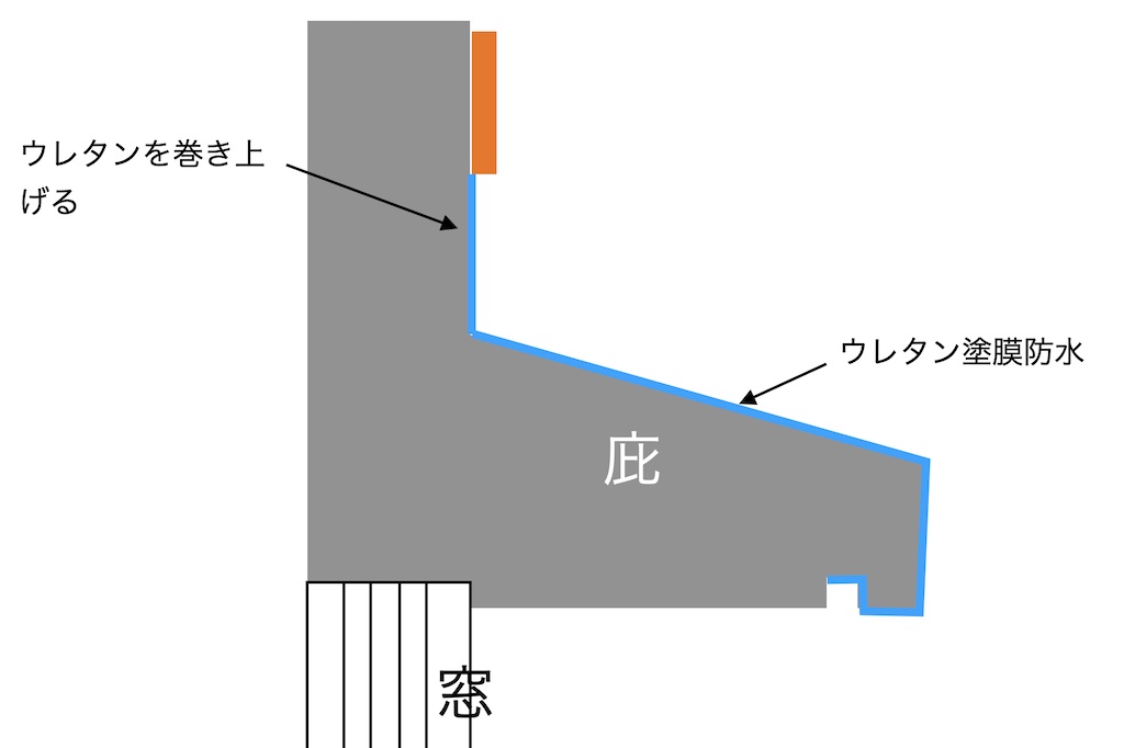 窓の庇は雨漏りが起こりやすい部分です。そのため施工にはとても気を使います。防水の仕方で雨漏りのリスクは変わるので、ウレタンを壁まで巻き上げる方法を推奨します。また庇のある窓から漏水が起こった場合は、庇の付け根の部分を疑ってチェックしましょう。ここから漏れるケースは本当に多いんです。