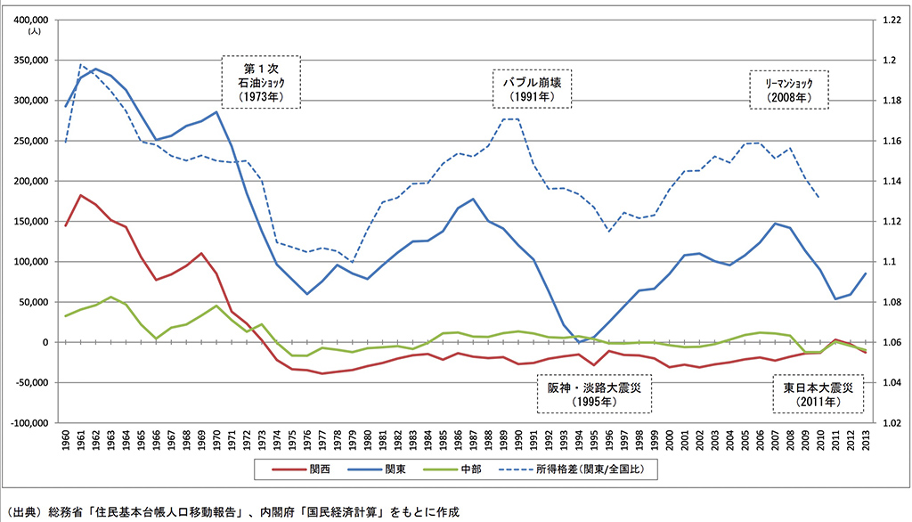 オイルショックの影響は大企業を直撃し、多くの企業が新卒採用を控えるようになりました。これにより集団就職が終焉し、地方から都市部への人口の流入がストップします。それどころか不景気が仕事を失い、都市部から田舎に帰る人も出てきました。これまで人口が増え続けていた都市部から、急に人が減り始めたのです。関東、関西、中部地区の人口増減を見ると、オイルショック以降に大幅な転出超過が起こっていることがわかります。
