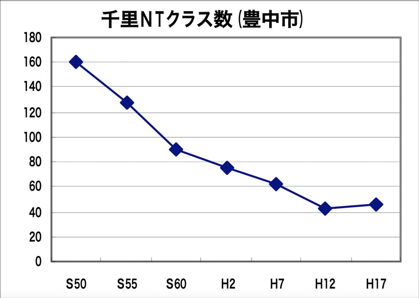 少子高齢化が進んでいるため、小中学校のクラス数がどんどん減っています。以下のグラフは千里ニュータウン近郊の学校のクラス数です。急速にクラス数が減っていることがわかると思います。