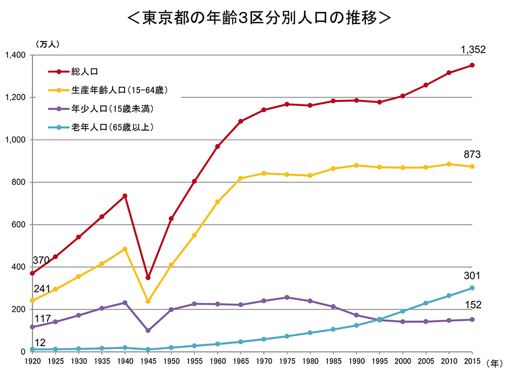 終戦直後の1945年の日本では、主要都市が焼け野原になったため住宅が420万戸も不足していました。さらに1950年代に入ると高度経済成長が始まり、都市部での住宅不足はさらに深刻化します。金の卵と呼ばれた中学校や高校を卒業した若者が集団就職列車によって大量に都心部に流れ込んだため、都市部は人口が過密になり多くの人が劣悪な住環境で生活することになりました。下図は東京都の人口の推移ですが、戦争で急激に人口が減った1945年から、高度経済成長により1975年頃までに人口が約3倍に増えていることがわかります。