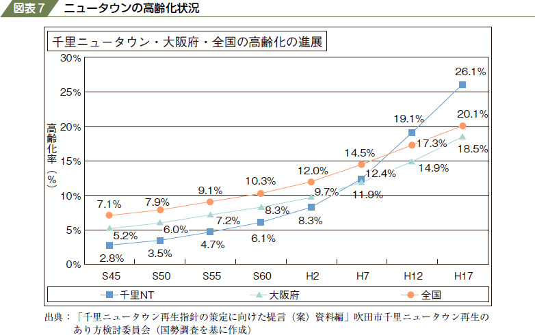 1970年代にニュータウンにマイホームを購入した人は、すでに70歳を超えている場合がほとんどです。ニュータウンの多くは、同じような年代の夫婦が同じ時期に同時に入居したため、一斉に高齢化を迎えている問題があります。以下は内閣府の資料にある千里ニュータウン(大阪)の高齢化率です。全国平均より高い割合で高齢化が進んでいることがわかります。