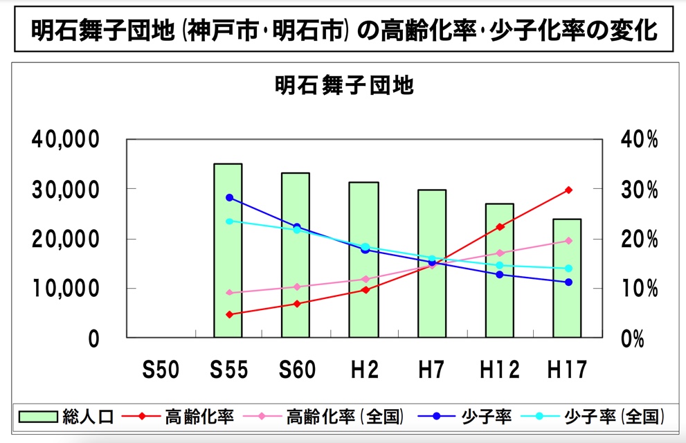 さらに以下の図は、神戸市垂水区にある明石舞子団地の高齢化率です。明石舞子団地は兵庫県と兵庫県住宅供給公社が開発を行い、昭和39年(1964年)に入居が始まりました。