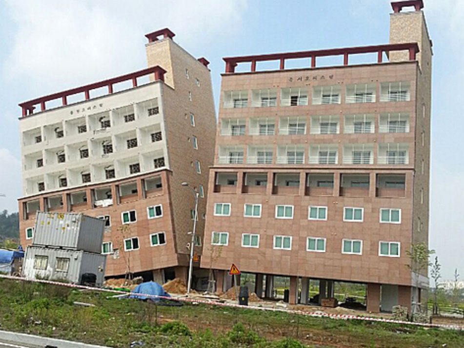 2014年5月11日、建設中の7階建てのマンションが突如30度近く傾く事件がありました。幸い死者などは出ませんでしたが、これほど建物が大きく傾く事故に多くの注目が集まりました。傾きの原因は施工不良で、必要な鋼管杭が69本のところが59本しかなく、1mの基礎が60cmしかないなどの施工不良が見つかりました。工事の現場責任者は行方をくらましたと報じられていましたが、その後どうなったかはわかりません。