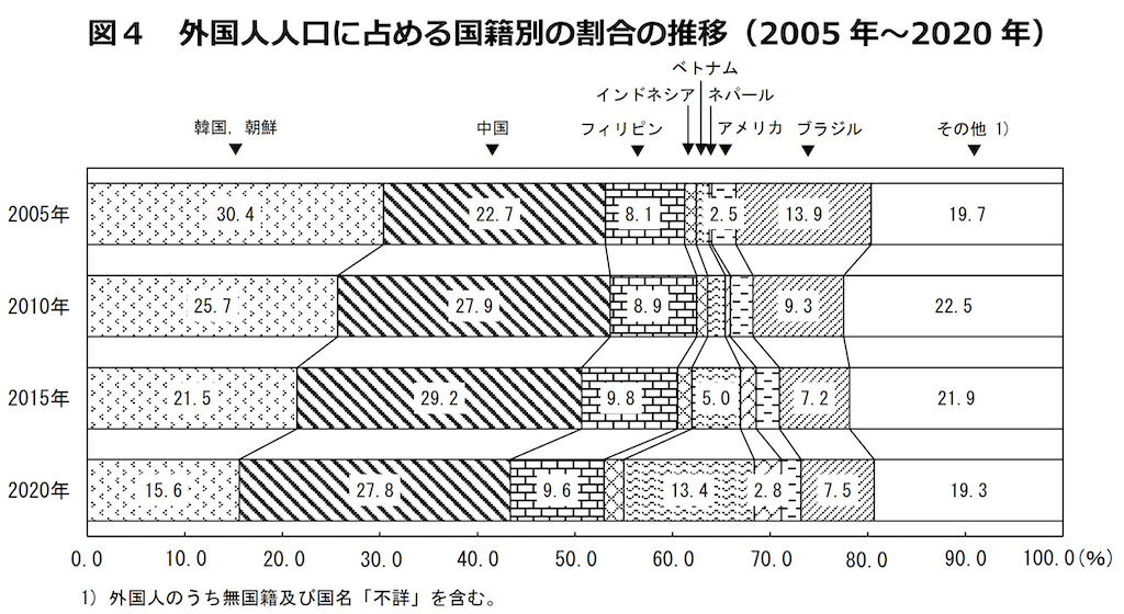 日本に居住している外国人を国籍別で見ると、「中国」 が 66万7千⼈、「韓国,朝鮮」が 37万5千⼈、「ベトナム」が 32万1千⼈の順位になります。現在、急上昇しているのは「ベトナム」で、2015年からが 5.0%から 13.4%に上昇しています。その一方で、「中国」「韓国,朝鮮」は減少傾向にあります。外国人の居住の目的は、永住者、定住者、技能実習⽣、留学⽣、就労など様々ですが、「ベトナム」は技能実習⽣や就労のため⼀定期間在留する人が大きく増加しているようです。
