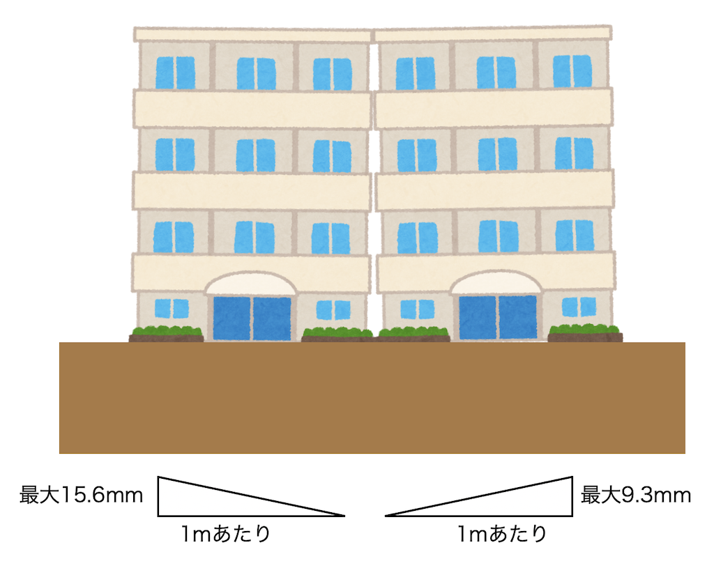 建物の構造計算をする際に、建物の荷重は長期荷重と短期荷重の2種類に分けて考えます。長期荷重は建物そのもの重さに加えて、家具や住んでいる人の体重を加えたものになります。一方、短期荷重は地震の際に加わる力が加わったものです。今回の件は長期荷重だけでマンションが傾いているので、地震の際にはかなり危険な状態だと推測されます。