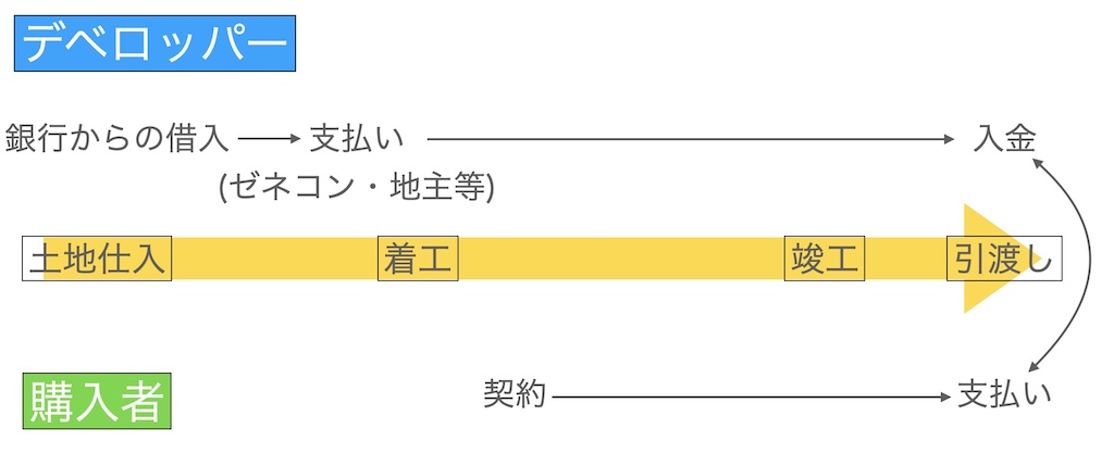 マンションを建設して販売するデベロッパーは、土地の購入資金とマンション建設費を銀行から借りています。事業開始と同時に数億円から数十億円の借金をするわけで、マンションを完売させて購入者に引き渡してから利益が確定します。この流れを図示すると以下のようになります。
