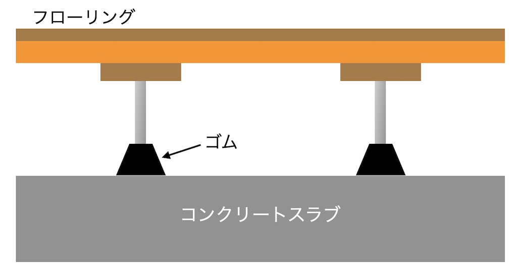 以下の図は二重床の断面図です。金属の足元をゴムで支えており、フローリングは宙に浮いたようになっています。フローリングにものを落としたり、歩くことで発生する振動をゴムが吸収しています。このゴムは上下階の防音性に影響する部品なので、違うものが使われていたとしたら問題です。