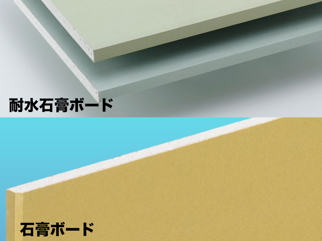 石膏ボードの表面は紙ですが、耐水石膏ボードは耐水紙が使われています。普通の石膏ボードの紙が黄色味がかっているのに対し、耐水ボードは緑がかっています。水回りの壁に耐水石膏ボードが使われることがあり、特に湯気が充満しやすい洗面所などに用いられています。トイレも手洗いなど壁に水がかかりやすい場所に使うことがありますが、デベロッパーの仕様によってはトイレには使わないこともあるようです。今回は設計図にはトイレにも使うことになっていて、実際には使われていなかったようです。