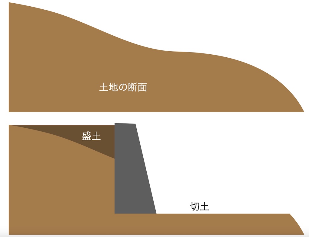 この開発行為を行う際に、盛土や切土が行われます。土地が斜めになっていて建物を建設するのに向いてない場合、土地を平らにするために行うのが盛土や切土です。盛土は土地の低い部分に土を盛って平らにすることです。切土は土地の高い部分を削って平らにすることを言います。以下は土地の断面図です。土地を平らにするために、土地を削ったり盛ったりするわけです。