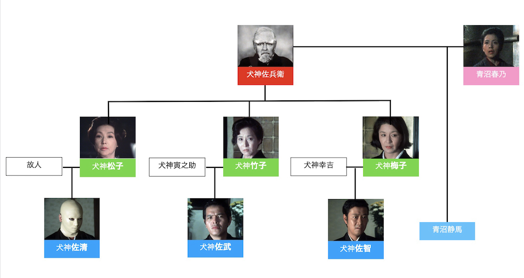 ④珠世が相続権を失うか死亡した場合は、佐清、佐武、佐智の順で事業を継承する。また全財産は5等分し、佐清、佐武、佐智に1/5づつ、2/5を青沼菊乃の息子の青沼静馬が相続する。