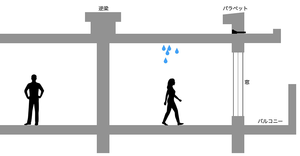 水張り試験を行った結果、ルーフドレンが原因ではないのは明らかなので、2回目の漏水が起こったのは当然と言えるでしょう。しかし2回目の漏水が起こった結果、再びルーフドレンの改修を行っています。私にはこの修繕は意味不明で、無駄にしか思えません。そして2回目の漏水の時は台風が直撃した時だったそうで、強い風がマンションを打ち付けていたようです。つまり普段の小雨程度では漏水は起こらないものの、強い圧力が掛かった時に漏水が発生するのです。この時点で推定できる漏水箇所は、1回目の時と同じくパラペットや庇、外壁や逆梁の反対側などさまざまな箇所が想定されます。