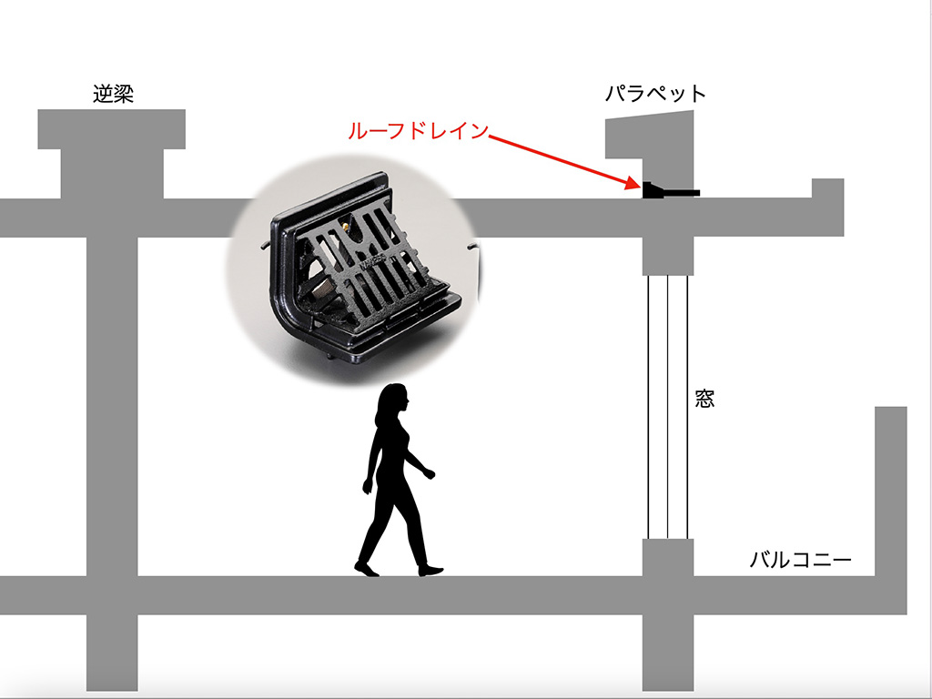 3階で起こった漏水は、当然ながらその上階のルーフバルコニーが原因ではないかと疑われました。このルーフバルコニーは広くて2住戸にまたがっていて、逆梁があるのが特徴でした。最初に漏水が発生した際に、水張り試験を行ったそうです。しかし試験中に漏水は起こらず、ルーフバルコニーからの漏水ではないという結論になったそうです。しかしその後の話し合いで、なぜかルーフバルコニーのルーフドレンに問題があるという話になり、ドレンの改修工事を行っています。
