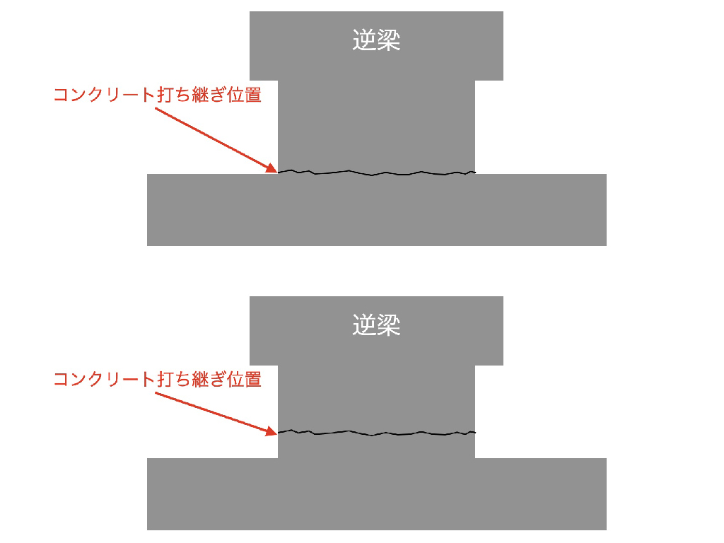 今回紹介した漏水も同様でした。逆梁を使う設計に加えて、逆梁のコンクリート打設には注意が必要です。しかし施工者が何も考えずに施工したのは現場の状態から明らかですし、設計管理者も注意していなかった様です。逆梁のコンクリート打設は2回に分けて行います。下の図の上の絵のように床と同じ高さで打継ぎを行うと、水が浸水してしまう可能性が高まります。そのため下の絵のように床より高い位置で打継がないといけないのです。